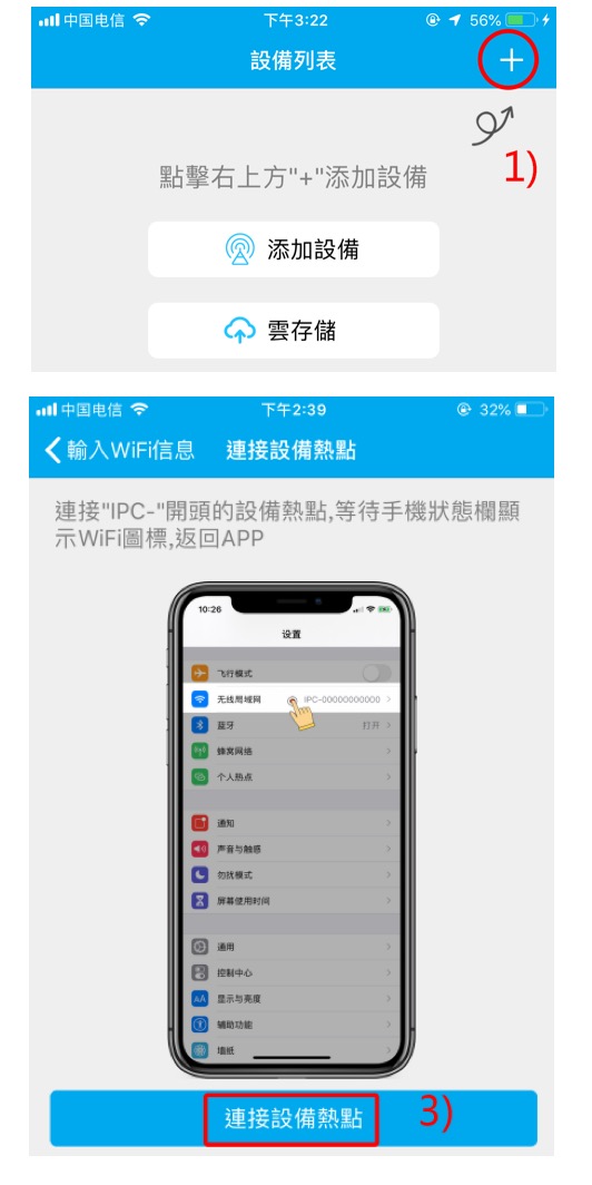 4)點擊【連接設備熱點】,將跳轉到手機系統WiFi設置,請連接“IPC-***********”格式的WiFi,然後返回APP。