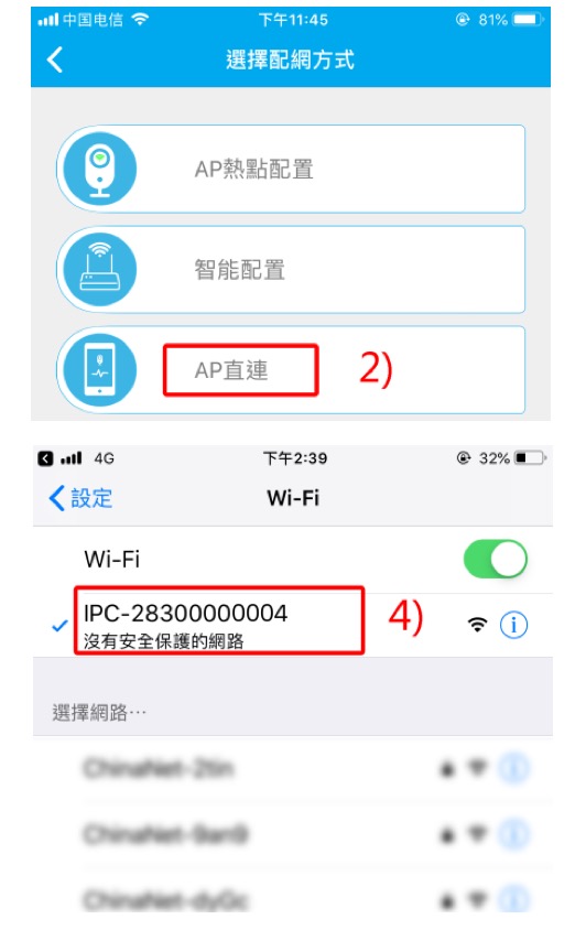 3)打開APP,根據以下步驟進行【AP直連】操作。