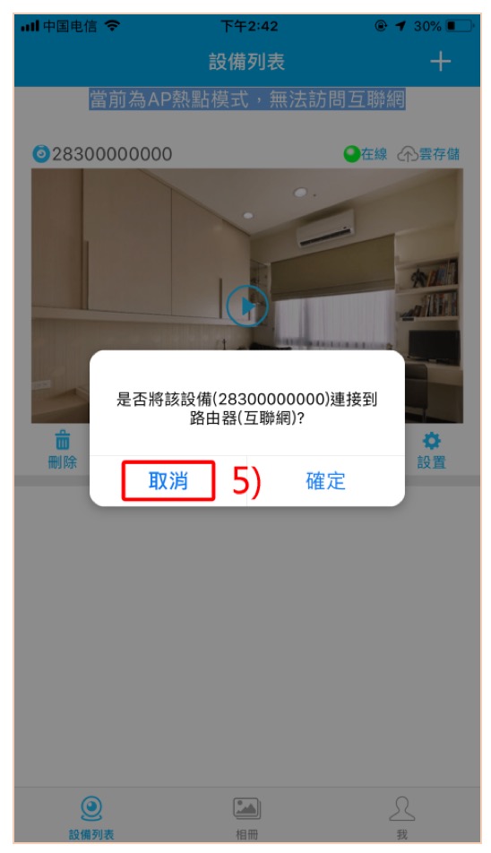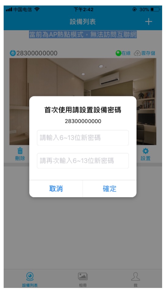 5) 連接 “IPC-*********** ” 格式的WiFi後,返回APP,設備會自動添加到設備列表。提示“是否將該設備連接到路由器(互聯網)?”點擊【取消】按鈕,點擊觀看視頻即可。 【首次使用需要設置設備密碼】。